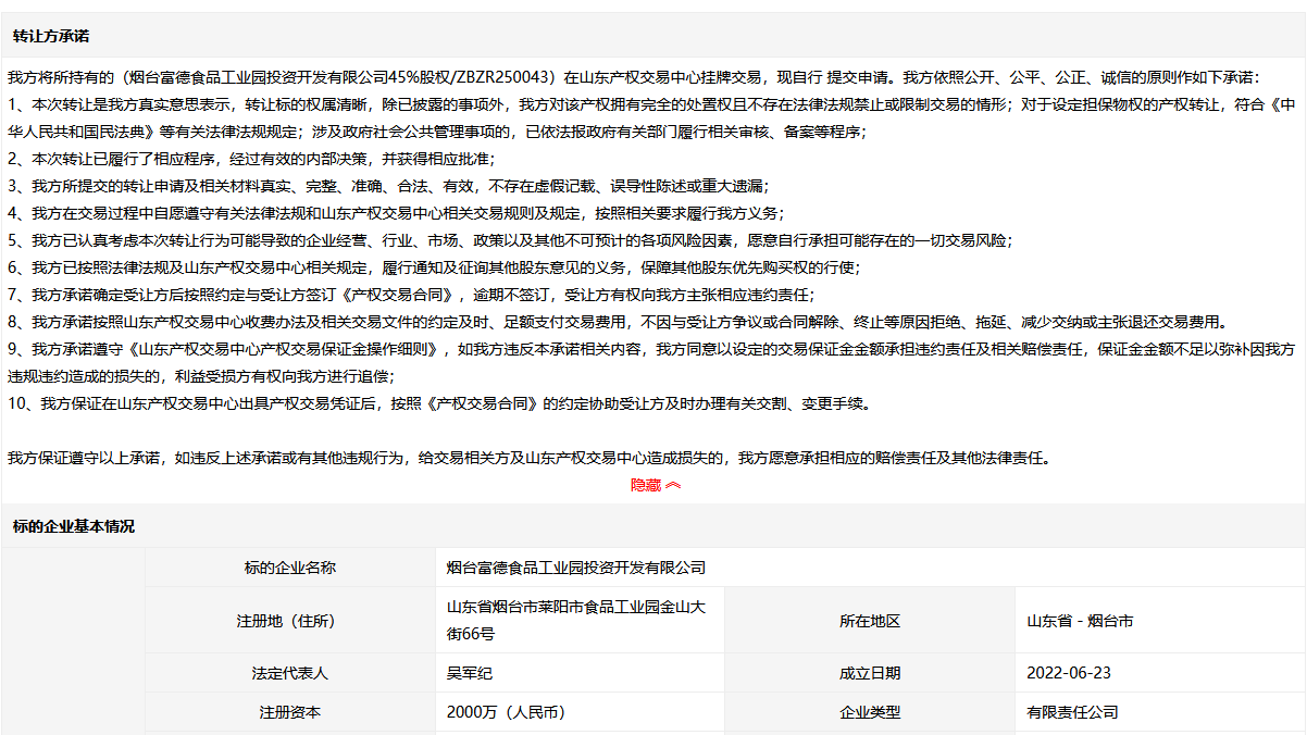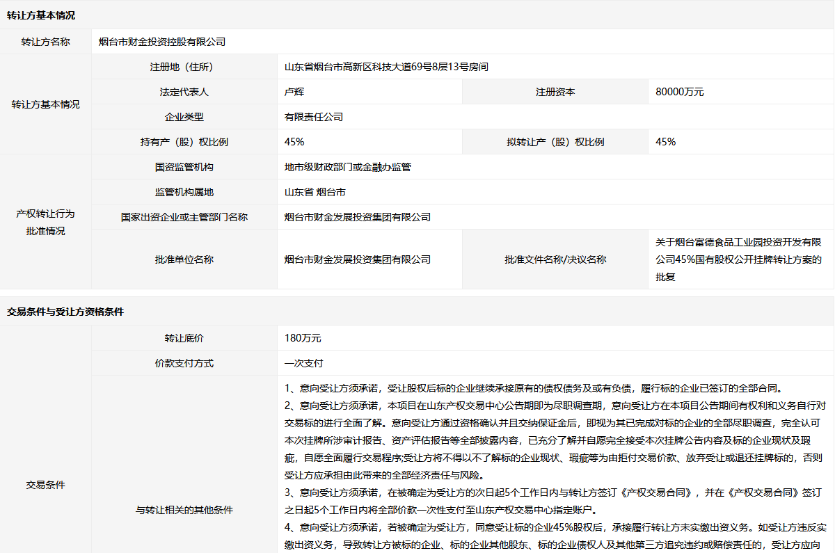 煙臺富德食品工業(yè)園投資開發(fā)有限公司45%股權